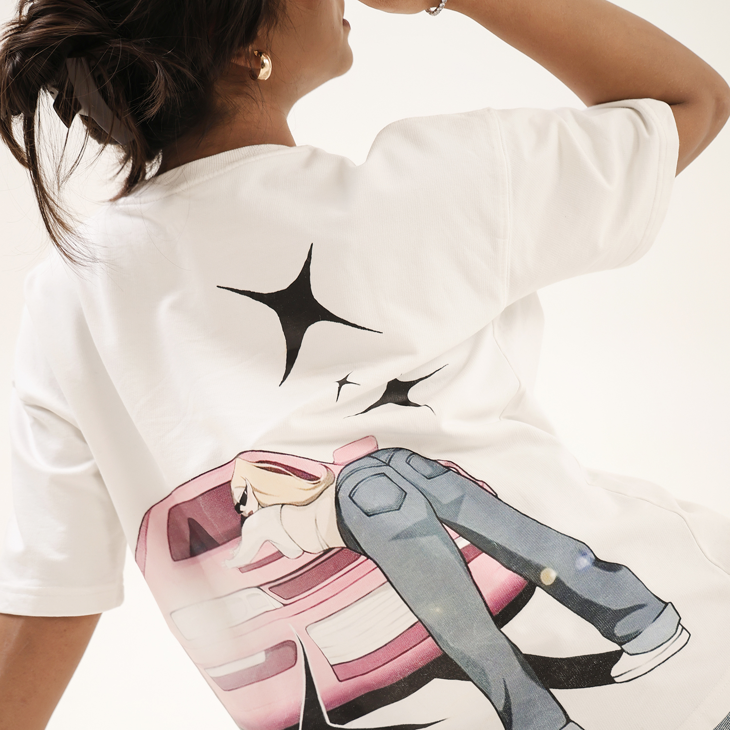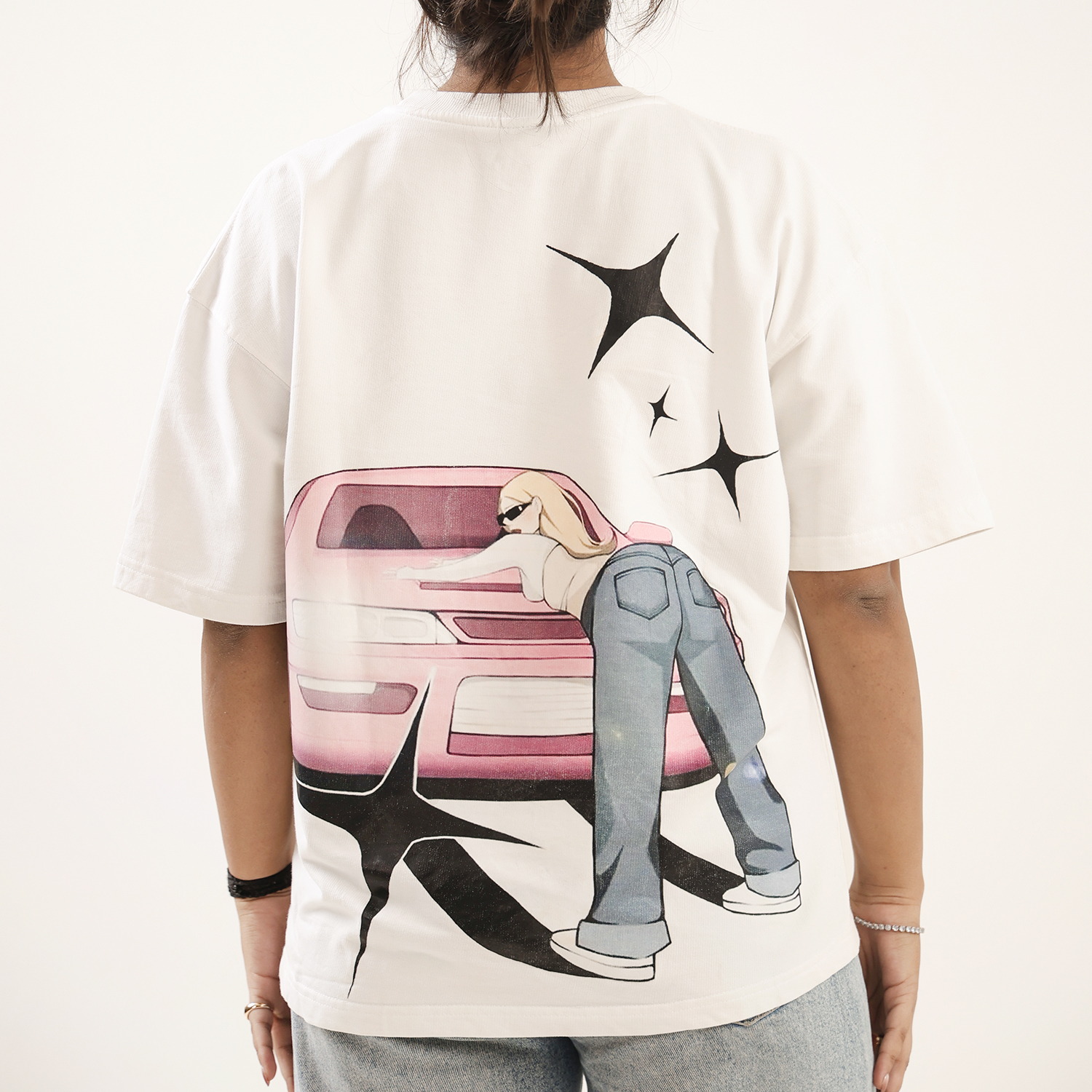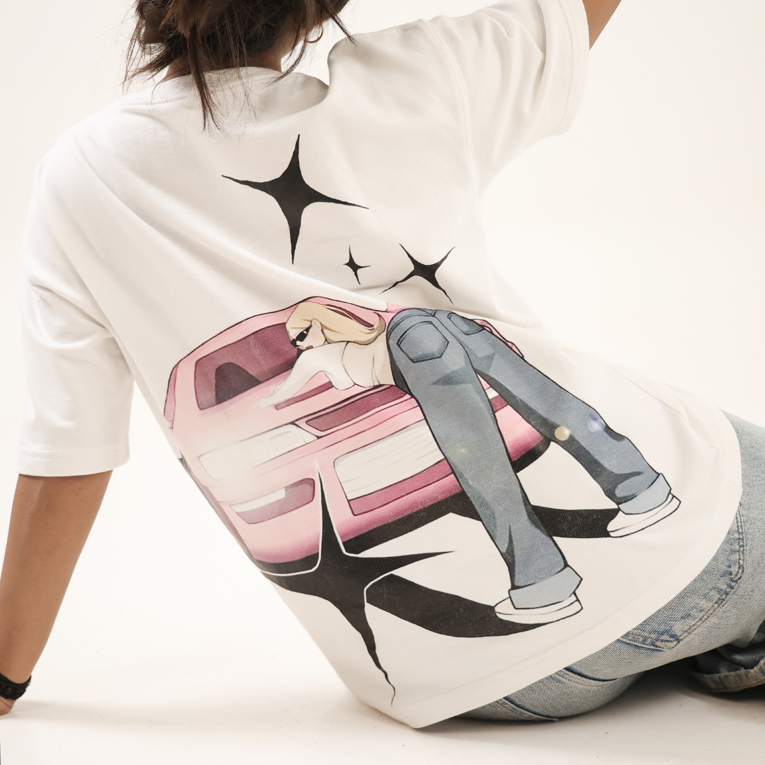 Dune Drip unleashes vibrant energy with this stacked car tower tee, a bold statement of speed and style. The oversized white shirt showcases a vertical stack of multicolored supercars—from electric green to fiery orange—rising dynamically, symbolizing relentless drive and luxury aspiration. Complementing it is a sassy pink car with a confident figure leaning in, blending feminine flair with high-octane attitude for an irresistible vibe.