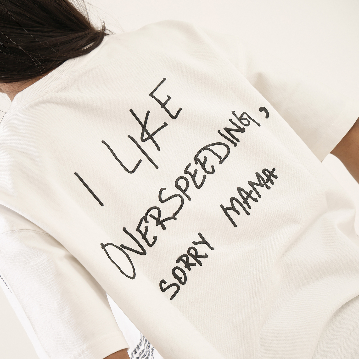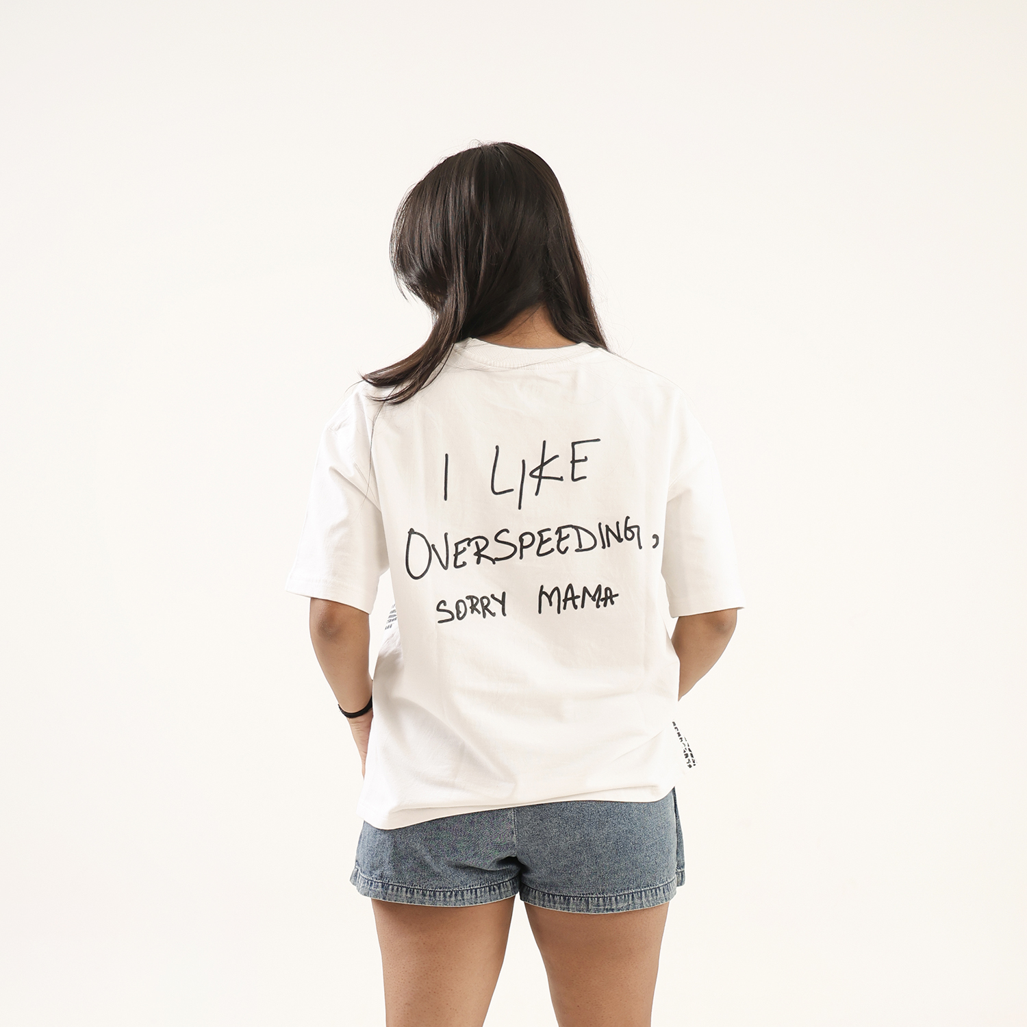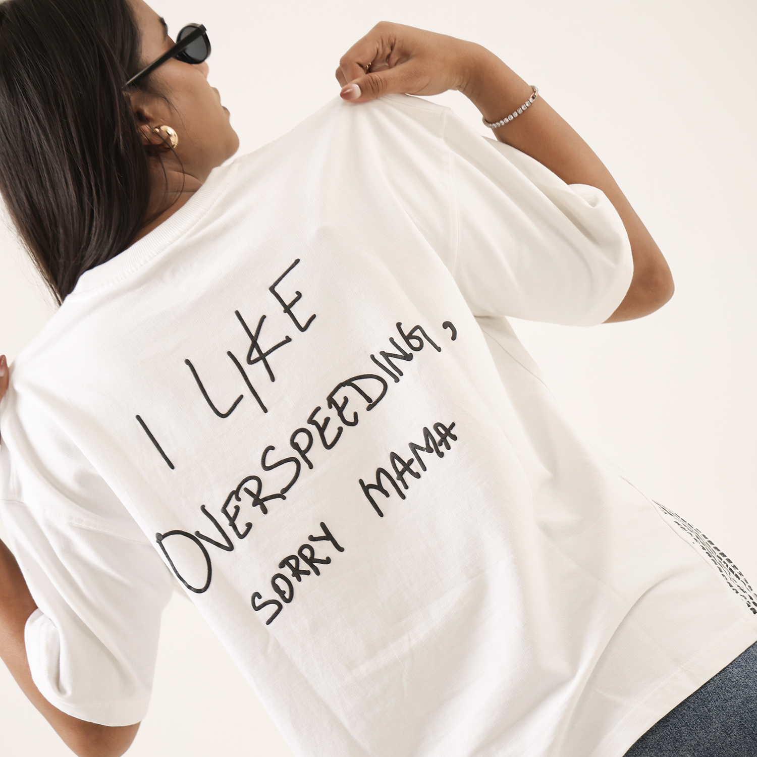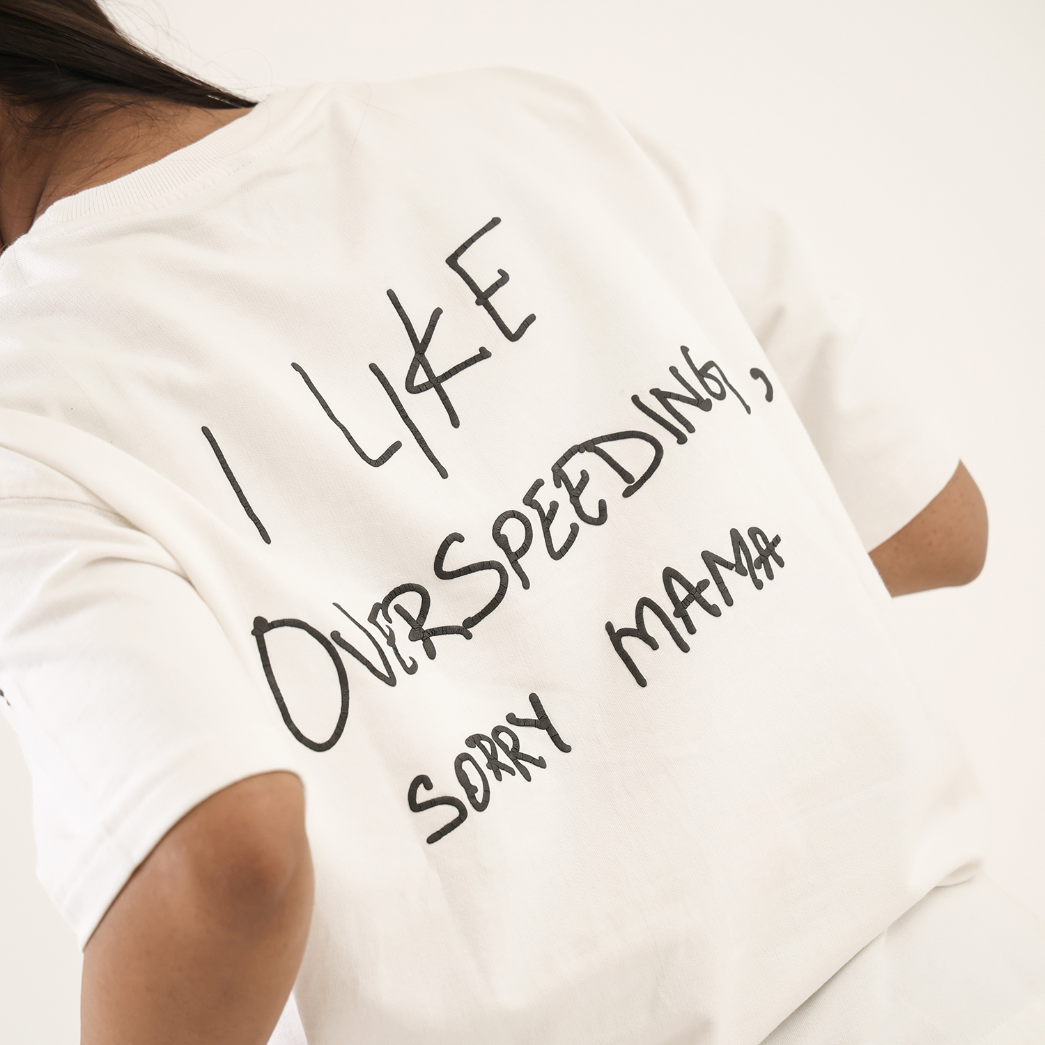 Dune Drip captures unapologetic thrill in this “Overspeed” tee, a nod to adrenaline junkies who live beyond limits. The off-white oversized shirt boldly declares “I like overspeed, sorry mama” in raw, graffiti-style script, accented by sweeping black tire skid marks that evoke high-speed chaos and street rebellion. It’s subtle swagger wrapped in premium comfort for the fearless driver within.